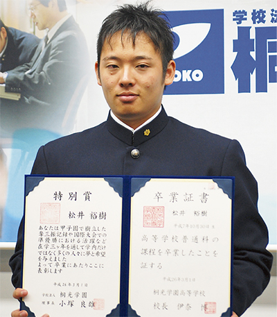 区内栗木の桐光学園高校で1日、卒業式が行われ、同校から東北楽天ゴールデンイーグルスにドラフト1位で入団した松井裕樹投手が出席した。同校は松井投手の活躍を讃え、卒業証書とともに初の特別賞を贈った。