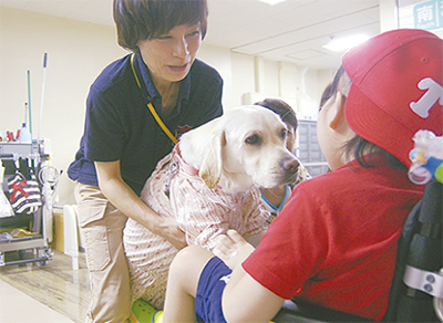 同病院では教職員有志でAAT活動を2年前から始めた。(公財)日本盲導犬協会、(社福)日本介助犬協会の協力のもと、現在までに13回の活動を行っている。現場からは「つらい入院生活のなかでよい思い出ができた」「明日から頑張れる」などの闘病意欲の向上が認められたという。