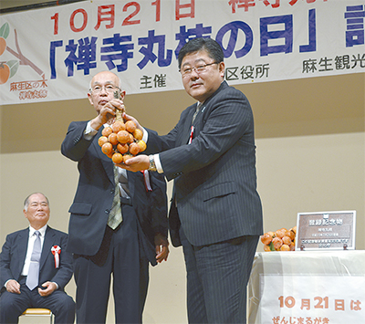 式典では、禅寺丸柿が2007年に国の登録記念物に指定され、文化庁からこのほど贈られた記念楯が披露された。また、今年収穫された柿が水野英雄保存会会長=人物風土記で紹介=から多田区長に贈呈された。