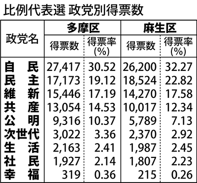 比例代表をみると、自民党が最も得票率が高く、多摩区と麻生区とも30%を超えた。川崎市全域では維新の党が民主党を上回ったが、多摩区麻生区とも民主党が維新の党を上回った。