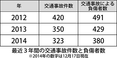同署によると、区内の年間交通事故件数は一昨年が420件、昨年が350件、今年が323件と、この3年間で大幅に減少。1月から11月までの対比では、すでに今年は過去最少を記録している。また、それに比例して、年間の交通事故による負傷者も一昨年が491件、昨年が429件、今年が380件と減少傾向となっている(件数はいずれも12月17日現在)。