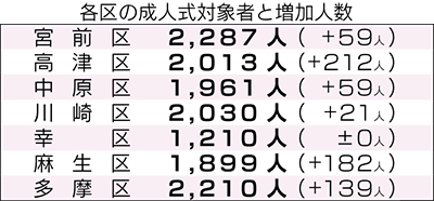 今年の川崎市の新成人は1万3610人(14年11月30日現在)で、ここ5年間で最多。麻生区では昨年より182人多い1899人が新成人となる。少子化が進む中、川崎市は人口増加などにより新成人が増加した。