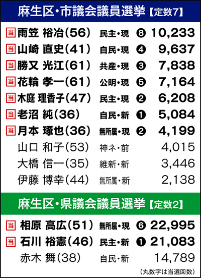 統一地方選挙川崎市議選と神奈川県議選が4月12日投開票され、麻生区市議選(定数7)は民主・雨笠裕治氏(56)が、県議選(定数2)は無所属・相原高広氏(51)が前回同様トップでそれぞれの選挙戦を制した。