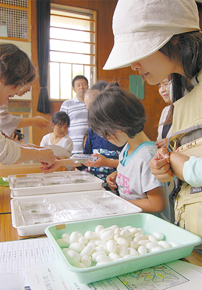 地域環境を活用した自然体験などを子どもたちに提供している「むじなが土曜塾」(平野敦士代表)が主催して実施されている養蚕講座は今年で11回目。この日は蚕のことや育て方などの講座の他、屋外に出て幼虫のエサとなるクワの葉の探し方などが行われた。講座後には希望者に1cmほどの小さな蚕が手渡され、参加者は育て方のコツなどを質問しながら興味深そうに見入っていた。