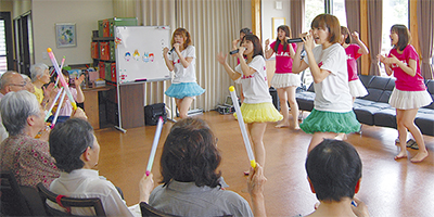 当日は正規メンバーの3人と研究生5人が参加。ほぼ一日、利用者とともに過ごした「純情小町」はミニライブ=写真=のほか、食事の配膳やレクリエーション、健康体操などを行い、世代を越え交流。互いに元気を与え合った。ミニライブでは、若さあふれるパフォーマンスに施設利用者らも一緒に腕を振り回したり、拍手をしたりと、盛り上がりを見せ、笑顔があふれていた。