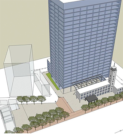 市の発表によると、超高層棟に行政機能と議会機能を配置し、最上階には議場と展望ロビーを設置する。総合設計制度を使って高層化を図るが、航空法によって116メートル以下となる。低層棟にはカフェや情報発信を行うスペース、イベントスペースに転用できる会議室などを設置する。市役所通りに面する南側は「新築復元」の工法を採用し、1938(昭和13)年の創建当時の姿を復刻するという。160台分の駐車場も設ける。新本庁舎の延べ床面積は6万3900平方メートル。