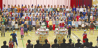 式典では、同校の児童らによる歌や太鼓の演奏などが披露され、盛り上がりを見せた。