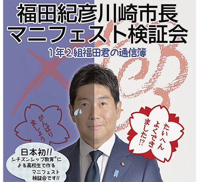 マニフェスト検証会への参加を予定しているのは、市内在住又は在学の高校生ら6グループ。福田市長が掲げた14項目・35のマニフェストについて、若者の視点から検証し、約90分にわたり意見交換を行う。また、マニフェストを評価する外部の専門委員会が作成した評価書を基にまとめられた、「1年2組福田君の通信簿」を来場者に配布するという。