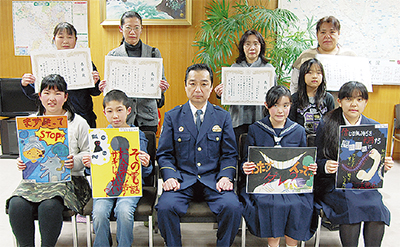 感謝状と記念品を受け取った小学校の部金賞の原田さんは「振り込め詐欺は怖いイメージで、題材選びがちょっと大変だったけど、犯人をオオカミにしてポスターを作りました」と話した。中学校の部金賞の犬飼さんは「(振り込め詐欺は)電話でなりすます悪い犯罪。ポスターは高齢の方でも見て分かりやすいものを、という考えで作りました」と話していた。