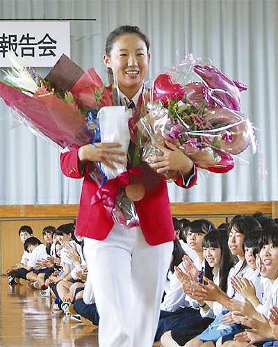 体育館で行われた報告会には全校生徒に加え地域PTA関係者など、900人以上が集合。日本代表の公式ジャケット姿の小俣さんが銅メダルを首にかけて登場すると大きな歓声と拍手に包まれた。