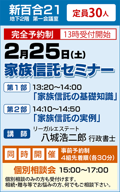 積水ハウス川崎支店は2月25日(土)、新しい相続の形といえる『家族信託セミナー』と、個別相談会を区内にある新百合21で開催する。先着順で定員30人(完全予約制)。現在参加者を募集している。