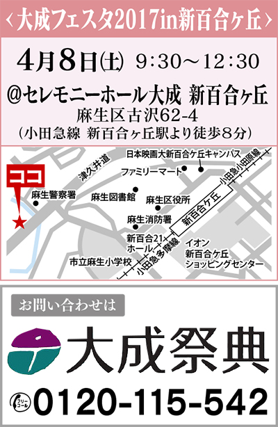創業90年を迎える大成祭典(株)が家族葬式場、セレモニーホール大成新百合ヶ丘で4月8日(土)、「大成フェスタ2017in新百合ヶ丘」を開催する。時間は9時30分から12時30分まで。入場無料、予約不要。