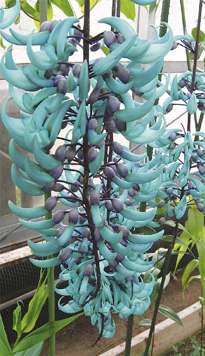 多摩区宿河原にある川崎市緑化センターの温室で、ヒスイカズラが初開花し見頃を迎えている=写真(3月15日撮影)。
