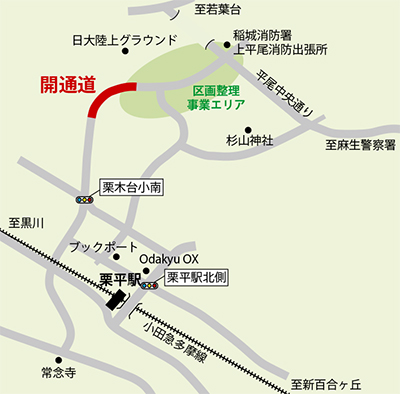 道路整備は土地区画整理事業の進捗に合わせ、2015年3月から今年3月までの工期で進められていた。道の開通によって栗木方面から若葉台へのアクセス向上、稲城市方面からは栗平駅に向かう生活道路としての役割が期待される。川崎市道路河川整備部は「新百合ヶ丘方面へ向かう平尾中央通りなどの交通量が分散されるほか、整理事業全体では両市の一体的なまちづくりによる効果も期待できる」としている。