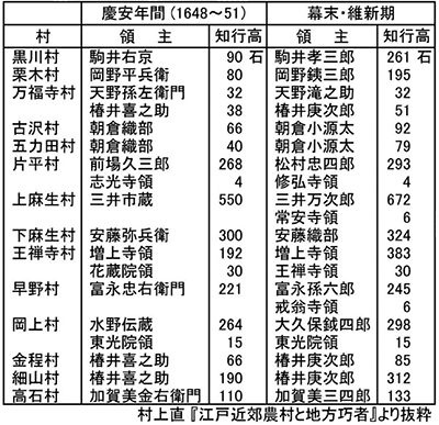 右記の表は、村上直氏著「江戸近郊農村と地方巧者」よりお借りしたものですが、同書や新編武蔵風土記稿、川崎市史などを参考にして、現麻生区内村々の領主(知行主)を少し詳しく調べてみると次のとおりです。なお知行高とは村の石高で、各領主は個別に石高に応じての年貢の決定・徴収権、領民使役などの領主権を持っていたといわれます。