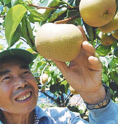 「寒い日もなく、雨量も少なかったので糖度は上がっていく。実の付き方も良く例年よりも美味しい梨が出来ているはず」。区内早野で梨栽培を行う金子昇さん(80)は炎天下の畑で笑顔を見せる。