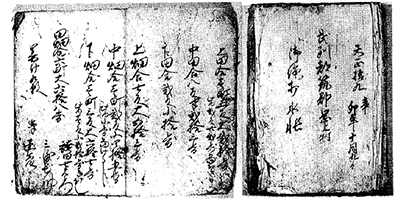 こうした徳川氏による天正十九年の初期検地は岡上村だけではなく、市内では下小田中・井田・苅宿・高石でも行われております。新編武蔵風土記稿は高石村の項で、検地水帳の存在を記しながら、検地人を知らず、とありますが、名主兵右衛門の先祖吉沢民部が村を開闢、村の民五苗により開墾されたと伝え、当時名主等によって検地があったことを思わせます。細山村の検地を前記風土記稿で見ると、「文禄三年(1594)八月六日検地のことあり、この時の水帳を見るに都筑郡小机の内細山郷」と記され、「小宮山八左衛門が奉行し、土方・白井・三輪・宮田なる者ども荒れ地を開墾し…」とあります。「武州都筑郡小机庄内細山郷御縄打水帳」は6帳からなり、案内人に蔵人・主水の名が記入され、田畑面積は破損で読み取れませんが、分付主には蔵人や主水などの名が記載されています。この水帳は西生田小学校に保存されていると言われています。
