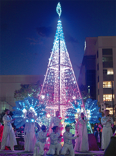 新百合ヶ丘駅前の冬を彩るイルミネーションイベント「kirara@アートしんゆり」の点灯が11日から始まった。初日には駅南口ペデストリアンデッキのメインツリー前で点灯式が行われた。