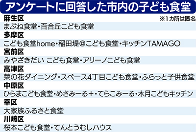 調査は一般財団法人かわさき市民しきん(廣岡希美代表理事)と専修大学の課題解決型インターンシップ生4人が実施。同法人が子ども食堂の活動に対し、助成を行うのに先立ち、7月からアンケート形式で進められた。両者は新聞記事やインターネットなどで情報を集め、市内21カ所の子ども食堂を確認。匿名を含む18カ所から回答を得た。