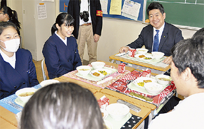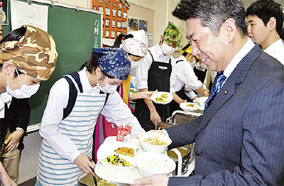 全校で給食化された1日、福田紀彦市長は今井中学校(中原区)を視察。配送された給食を確認した後、3年生の教室を訪れ給食係から配膳を受けた=写真上。スープが全員に行き渡らないことを知った市長が、自らスープを戻そうとし生徒から止められる一幕もあるなど、和やかな雰囲気のなか給食を楽しんでいた。