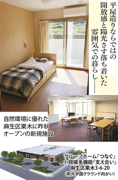 麻生区栗木の閑静な住宅地に昨秋、ゆとりを感じさせる平屋建ての福祉施設が完成した。オープンしたのは認知症に対応するグループホーム「つなぐ」と、宿泊可能な小規模多機能「支え合い」の2施設。グループホームは18人、小規模多機能は通い9人と宿泊5人までを受け入れる。