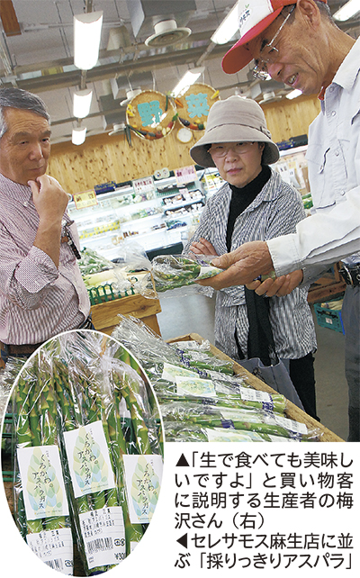 梅沢正廣さん(67)=麻生区黒川=は、アスパラ栽培に挑戦している農家の一人。昨年150株を譲り受け、元木准教授の指導を受けながら、育ててきた。この春に初収穫を迎え、3月12日にJAセレサ川崎の大型直売所「セレサモス麻生店」へ初めて出荷した。