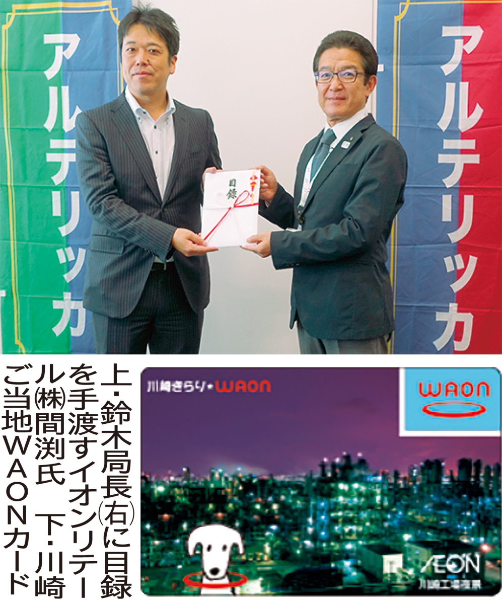 この寄付は全国で両社が手掛ける社会貢献活動の一環。イオンリテールが発行している電子マネー「WAON(ワオン)」のご当地デザインカード利用金額の0・1%を寄付している。川崎市では「川崎きらり★WAON」が発行され、14年から寄付が続けられている。