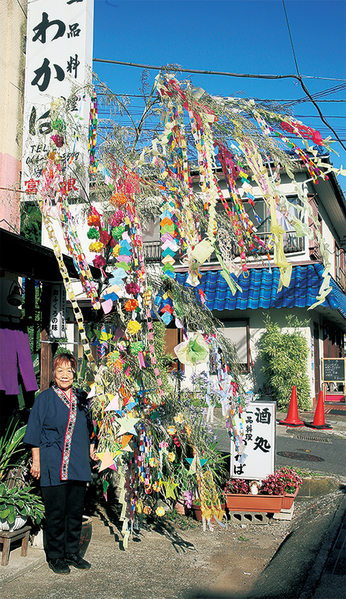 これは、店主の石田徳子さんが開店以来50年近く続けているもの。笹には来店客が願い事を書いた星型の飾りや、石田さんの家族らが手作りした色とりどりの飾りが付けられている。石田さんは「柿生で他にこういうのは見ないし、店が通り道に面しているので皆さんに見てもらえるようにと続けている」と話す。笹飾りは七夕終了後、熱海の身代わり不動尊に届けるという。