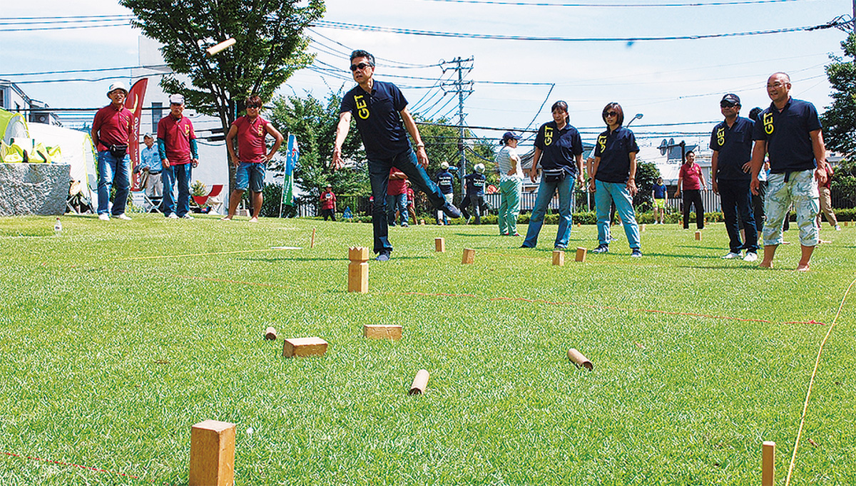クッブはスウェーデンの薪投げによる的あて、陣取りゲームを6人1組のチームスポーツにアレンジしたもの。参加者は相手陣地にある木片めがけて棒を投げ、ナイスショットが生まれるとハイタッチで喜び合うなどゲームを楽しんでいた。