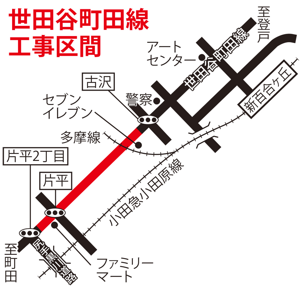 工事が行われているのは世田谷町田線の古沢交差点(古沢4の1)から尻手黒川線と交わる片平2丁目交差点(片平2の25の1)周辺までの約900メートル。交通の円滑化と歩行者の安全確保を目的に、車道と歩道の拡幅、歩道の無電柱化が進められている。これまでは小田急線側の工事が行われており、25日の登戸方面の車線振り替えが行われた後、反対の片平側道路で作業が行われる。