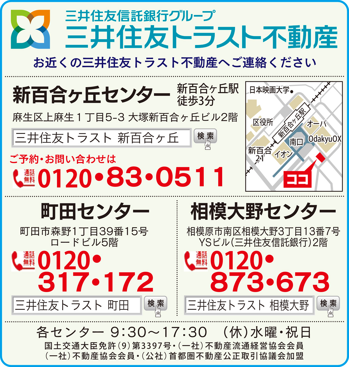 信託銀行系の不動産会社として信頼を得る「三井住友トラスト不動産」が11月10日(土)に首都圏一斉となる税務相談会を開催する。じっくり話ができる予約制(相談無料)で、5月開催に続く人気の企画。新百合ヶ丘センターのほか、町田、相模大野の各センターでも実施される(町田では弁護士による法律相談も開催)。時間は各センター午前10時から午後5時まで。