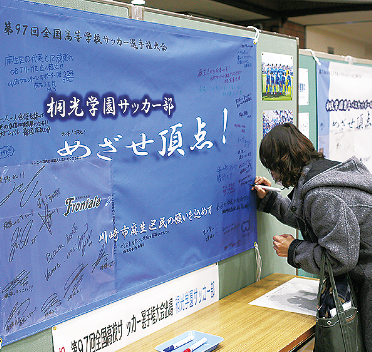 区民のほか、川崎フロンターレや川崎ブレイブサンダースの選手もメッセージを書き込んだ。麻生区在住の女性(49)は「子どもが桐光学園に通っていることもあって書いた。今年も頑張ってほしい」とエールを送った。