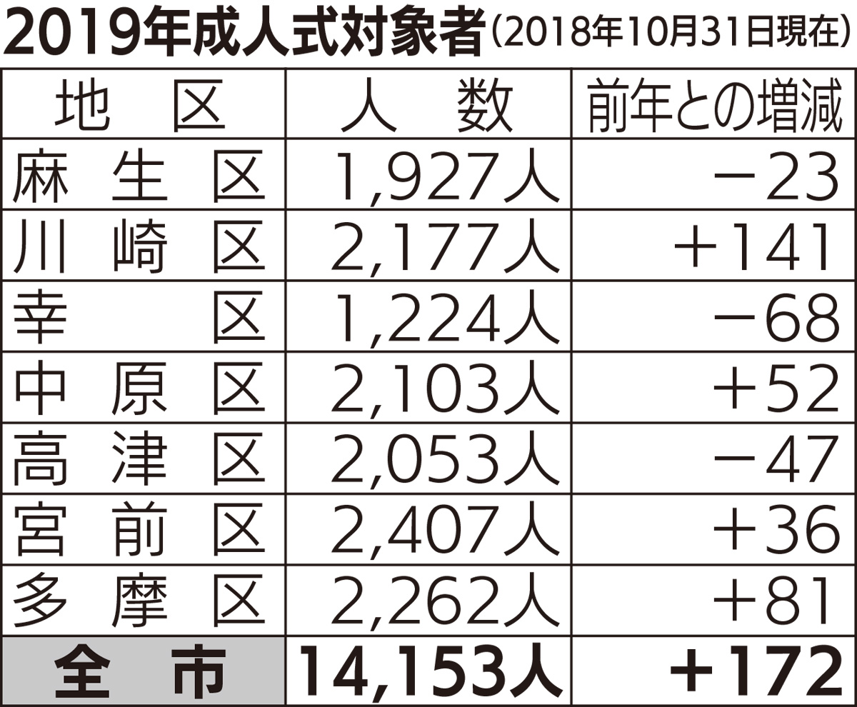 麻生区は昨年より23人少ない1927人となった。対象者の最多は宮前区の2407人。最少は幸区の1224人。