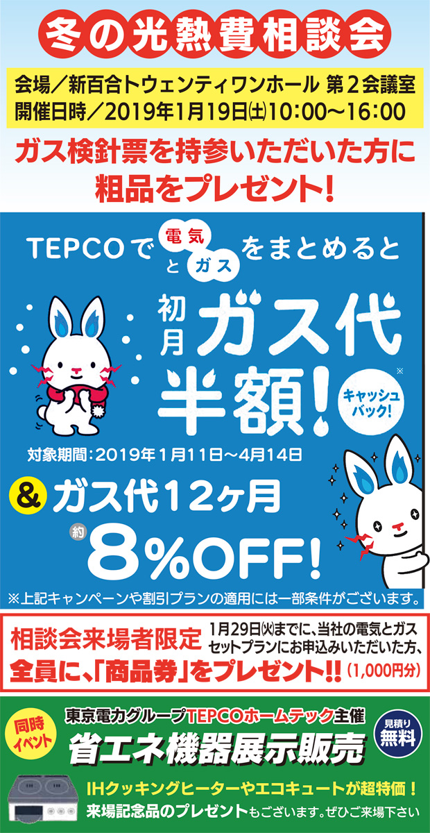 暖房などで光熱費が家計を圧迫するこの季節。ガスや電気の料金を節約する方法を知ってもらおうというキャンペーンが、新百合ヶ丘駅そば「トウェンティワンホール」で明日19日(土)、実施される。
