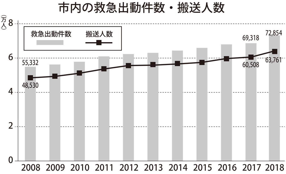 増加傾向を受けて市消防局は、救急隊の増設を進めている。2008年に24隊だった救急隊は、現在28隊。さらに、20年4月に宿河原(多摩区)に救急隊を1隊増設する予定だ。