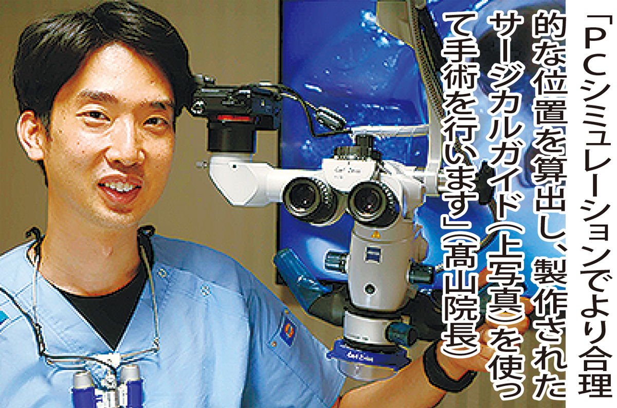 国際基準の技術と設備の下、インプラント治療も行う同医院。高山祐輔院長(日本顎咬合学会 咬み合わせ認定医)は「インプラントは外科的な治療とそれにまつわる神経損傷などのトラブルがマイナスイメージでした」と話す。同医院は安全性と精度を高めるため、PCシミュレーション情報から位置設定を算出。3Dプリンタで製作した「サージカルガイド」を使用して手術を行う。「CT画像も併用してフリーハンドでは不可能な手法です」と高山院長。「その方に合わせ最善な診療ができるよう、状況を共有し、ご理解頂いた上で治療を行います」と同医院は話している。
