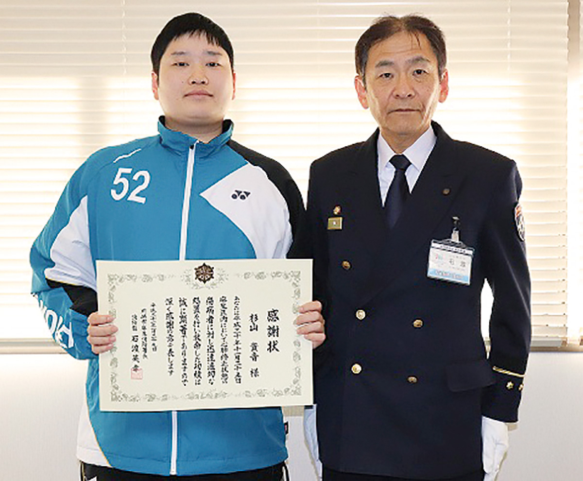 麻生消防署(石渡英幸署長)は先月29日、適切な処置で救命活動を行ったとして杉山貴音さん(28)=片平在住=に感謝状を贈呈した。