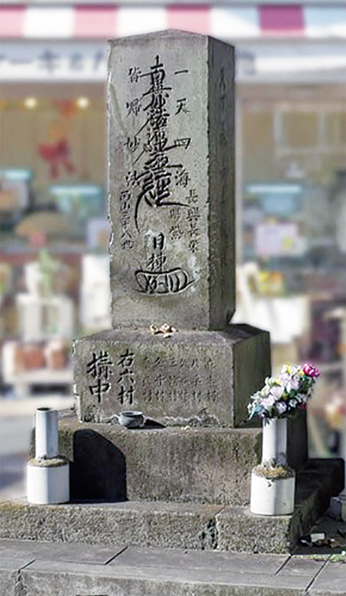 柿生駅前商店街通り(旧津久井往還)に「麻生の法塔様」と呼ばれる大きな石塔があります(左写真)。これは日蓮宗の題目講中が寛政11年(1799)に建立したもので、正面には「南無妙法蓮華経 一天四海皆帰妙法」と刻まれ、右側面には「天下泰平 五穀成就」、左側面に「奉唱満玄題目一万部供養塔」と記されています。この塔は、お題目を一万部奉唱したので建てたとの碑文が池上本門寺38世日棟上人によって揮毫(きごう=毛筆で文字や絵をかくこと)され、台座には、「麻生村 片平村 能ヶ谷村 三輪村 金井村 奈良村 右六村講中」と建立者が記され、その台石には、六ヶ村内各家の先祖200余名の名が綿々と刻まれています。