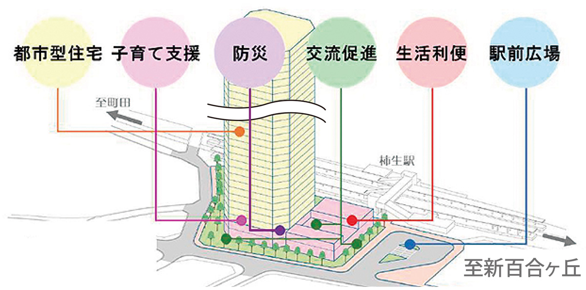 現在の柿生駅周辺の課題として挙がる狭小な駅前広場、歩道の整備、賑わいの不足などを解決しようと市は民間活力を含めた再整備計画を進めている。駅南口を走る商店街道路の東側に新たに整備する柿生町田線、それによって駅前広場を拡幅しバスロータリーを駅前に配置するといった整備と歩調を合わせて進むのが、柿生駅南口の再開発事業だ。