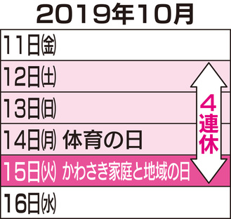 市教委は今年10月15日の火曜日を「かわさき家庭と地域の日」に設定。市立の全ての小学校と中学校、一部の高校は体育の日を含めた10月12日〜15日が4連休となる。夏休みや冬休みといった長期休暇、授業参観日の振替休日を活用して各学校で調整するため年間の授業時数に変更はない。