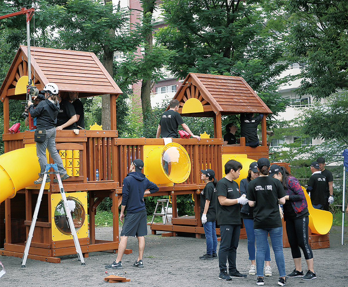 同社の遊具設置ボランティアは今回で21回目。当日は同社社員とNPOメンバー、投資ファンド運用会社のブラックストーン・グループ・ジャパンの社員、約80人が参加。遊具のなかった園庭に、複合遊具やベンチ、サッカーゴールなどを朝から1日かけて製作し設置した。完成後、園児はできたばかりの遊具にさっそく駆け寄り、笑顔で遊んでいた。同オフィスのティモシー・ソーパー運営最高責任者は「十分な心の大人に成長するためにも子どもたちにはいっぱい遊んでほしい。作ったものが目に見える作業は社員のチームビルディングにもつながっている」とコメント。同園の霜倉博文施設長は「園の子どもが学校の友達を連れて遊んで、楽しんでもらえれば。ゆくゆくは地域にも還元したい」と話していた。
