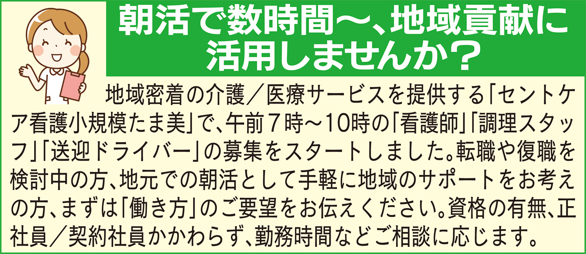 今月1周年を迎えた麻生区多摩美の「セントケア看護小規模たま美」で朝の時間帯を有効活用できるスタッフ(看護師、調理、送迎ドライバー)の募集が始まった。