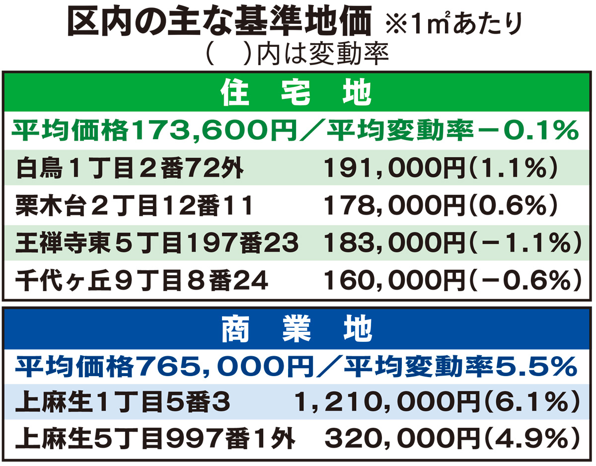 商業地価は新百合ヶ丘駅南口の「上麻生1丁目5番3」が121万円で、前年から6・1%上昇。柿生駅前の1地点も地価は上がり、2地点平均で5・5%上昇。平均変動率で見ると市内7区の中で最も高い率となった。