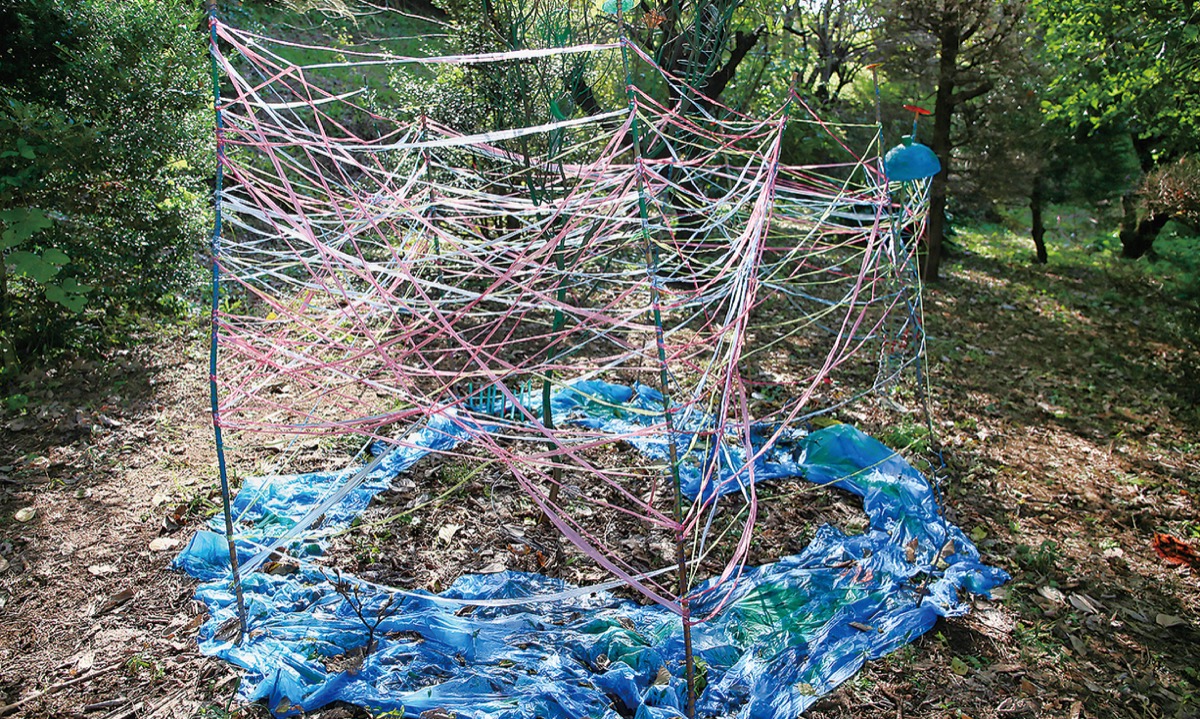 期間中は、同大表現学部芸術学科の学生と教員による16作品が田畑や岡上梨ノ木緑地に出現。来場者は作品マップを頼りに、里山の自然風景を楽しみながら、写真や立体といった1つ1つの作品を味わっていた。