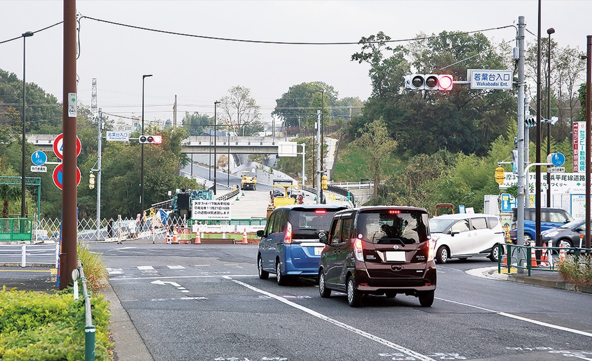 麻生区と多摩ニュータウンを結ぶことで、両エリアの利便性向上が期待される坂浜平尾線。若葉台交差点付近の日中(12時間)自動車通行量は鶴川街道が約12600台、学園通りは約4800台。坂浜平尾線の供用開始後は生活道路に流入する車両の減少も見込まれている。