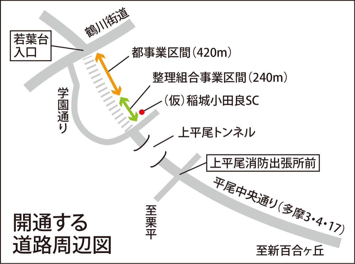 開通するのは、上平尾トンネルの若葉台側出口付近から鶴川街道に向かう約660メートルの車道と一部歩道。同区間はトンネル出口から240メートルを地元の土地区画整理組合が、その先から鶴川街道までの420メートルを東京都がそれぞれ整備していた。