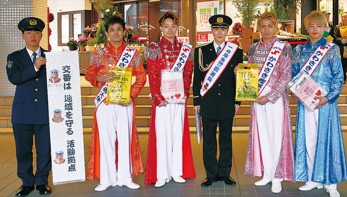 かわさき産業親善大使を務める神崎さんは、歌とダンスを主体としたレビューショーを制作し、市アートセンター等で公演。一日警察署長は2017年にも委嘱されており2回目だ。当日は同じく親善大使を務めるボーイズレビューユニット「10carats」のメンバーと新百合ヶ丘エルミロード前に登場。神崎さんは「振り込め詐欺は誰にでも起こりうること。今回の活動で詐欺に引っかからないよう気をつけてほしい」とあいさつ。警親会多摩麻生支部らと一緒に、声をかけながらチラシセット200部を通行人に配布した。写真撮影にも応じていた。