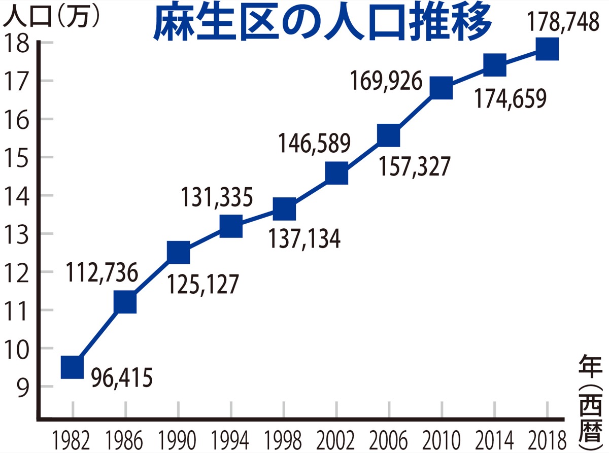1982年7月1日、多摩区から分区するかたちで誕生した麻生区。当時の人口は9万6415人で、そこから88年に12万人、2004年に15万人を超え、人口が増加してきた。