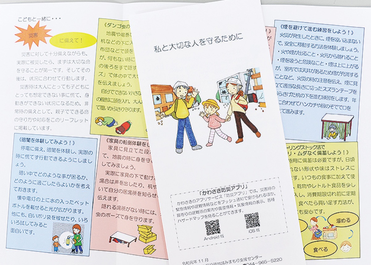 麻生区はこのほど、未就学前の子どもと保護者に向けた「ぼうさいリーフレット〜私と大切な人を守るために」を初めて作成し、各保育所や児童施設で配布している。イラストを多用し役立つアイデアなど掲載している。