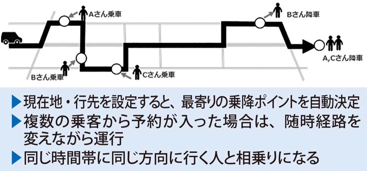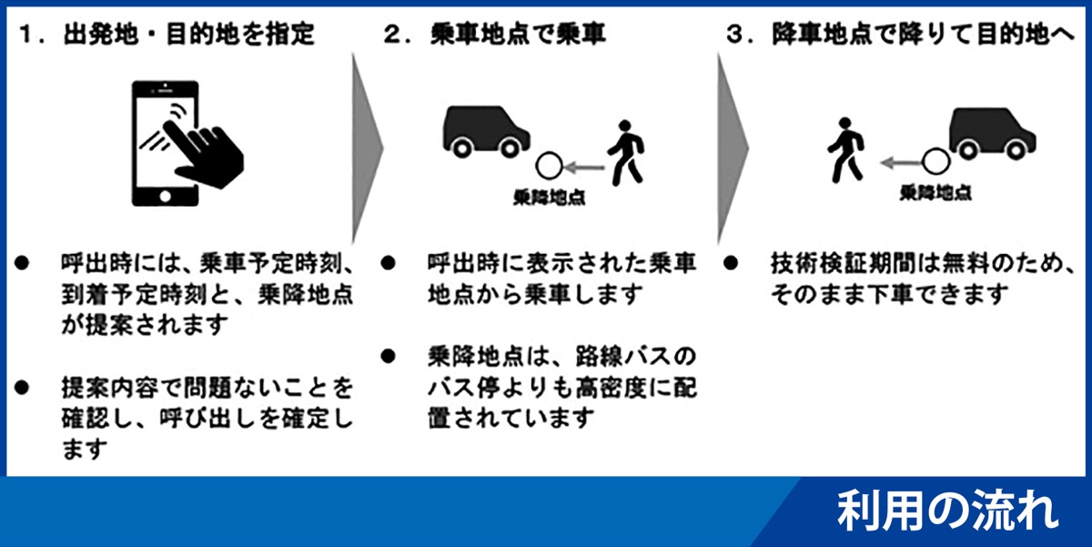 同社は、実証運行を通じ、新しい地域交通手段としての可能性や配車の効率性などを検討する。電車やバス、タクシーなどの交通データを活用したアプリ「EMot(エモット)」との連携も目指している。